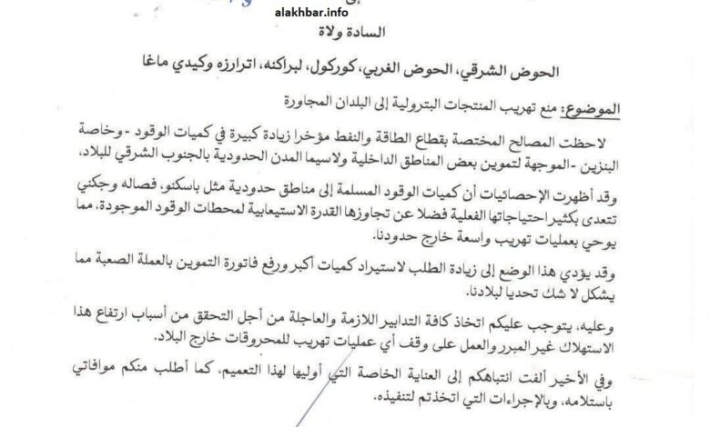 أمر وزير الداخلية وترقية اللا مركزية والتنمية المحلية محمد أحمد ولد محمد الأمين ولاة الولايات الجنوبية والشرقية من البلاد باتخاذ الإجراءات الكفيلة بوقف أيّ تهريب للوقود إلى البلدان المجاورة.